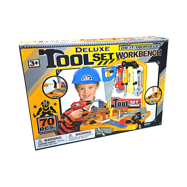 Delux radionica sadrži 70 elemenata poput: šrafcigera, čekića, testere, francuskog ključa, šrafova, matica i drugih elemenata