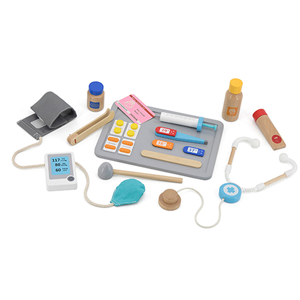 Set uključuje: ordinaciju, osnovni pribor za rad doktora i medicinske sestre (Stetoskop, merač krvnog pritiska, refleksni čekić, termometar, oprema za rendgenske preglede, špricevi, tablete)