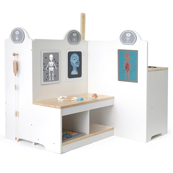 Drveni medicinski centar Viga 24686 je igraonica u obliku doktorske ordinacije za male lekare. Drveni medicinski centar Viga 24686 je dimenzija 90x94x110cm, sa visinom stola od 55cm. Napravljena je u potpunosti od drveta, obojenog bojama koje su netoksične i bezbedne za dečiju upotrebu. Drveni medicinski centar Viga 24686 se sastoji od tri dela: recepcije i čekaonice, umivaonika i lekarske ordinacije. Lekarsku ordinaciju čine sto sa dve police, a na zidovima su okačeni rengen ljudskog kostura, glave i anatomija. Recepcija se sastoji od računara, kao i polica za odlaganje pribora, kao i jedan odeljak za karton pacijenta. Pored je umivaonik, a sa druge strane, prostor za merenje visine, kao i proveru vida. Drveni medicinski centar Viga 24686 dolazi u setu sa potrebnim doktorskim priborom, poput stetoskopa, šprica i sličnog. Kroz igru sa ovim setom, dete uči o poslu lekara i medicinske sestre i može da služi za smanjenje straha od lekara. Drveni medicinski centar Viga 24686 je odličan poklon za dete koje želi da postane lekar ili medicinski tehničar, ali i za male radoznalce, koji vole da igraju igre uloga. Takođe je odličan izbor za vrtiće, gde deca mogu zajedno da uživaju u igri pretvaranja.