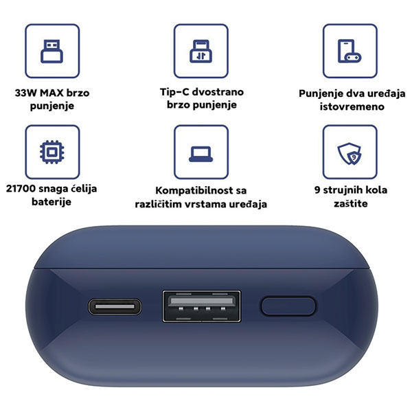 Eksterna baterija Power Bank 10000mAh 33W Pocket Pro Xiaomi GPS01038 je praktičan i efikasan uređaj za punjenje vaših mobilnih uređaja u pokretu. Sa kapacitetom od 10000mAh, omogućava vam brzo punjenje uz maksimalnu snagu od 33W, što je idealno za brzo dopunjavanje uređaja poput pametnih telefona, tableta i drugih elektronskih uređaja. Ovaj power bank podržava višestruko punjenje sa dva USB-C priključka i jednim USB tip A portom, pa možete puniti dva uređaja u isto vreme. Uz 9 strujnih kola zaštite, pruža sigurnost u svim uslovima korišćenja, sa zaštitom od pregrevanja, kratkog spoja, prenapona, prekomerne struje, kao i zaštitom od prekomernog punjenja i pražnjenja. Dimenzije power banka su kompaktnog dizajna (105mm x 55.8mm x 25.5mm), a njegova plava boja mu daje moderan i atraktivan izgled. Pored toga, uređaj omogućava brzo punjenje uređaja sa različitim specifikacijama (5V 3A, 9V/2.5A, 12V/1.8A), čineći ga kompatibilnim sa mnogim uređajima na tržištu.