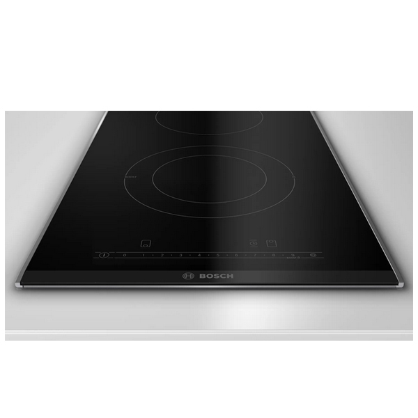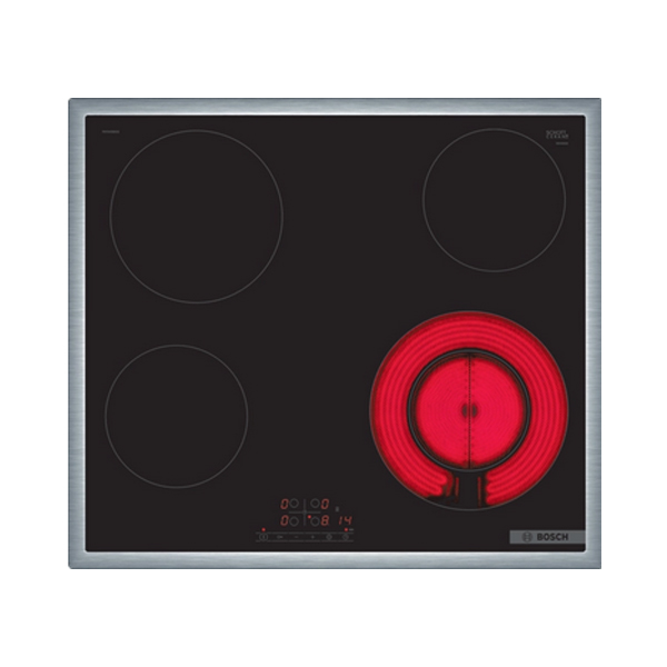 Električna ploča za kuvanje 60cm crna serija 4 Bosch PKF645BB2E je nezavisna ugradna ploča sa četiri grejne zone. Izrađena je od staklokeramike, modernog dizajna sa okvirom od nerđajućeg čelika za lakšu montažu. Uređaj omogućava spajanje dve zone grejanja, što je posebno korisno kod kuvanja u većim posudama, kao što su Teppan Yaki posuda, gril ploča, veći lonac. Komande ploče su osetljive na dodir, pa omogućavaju jednostavno podešavanje svih bitnih parametara. Sigurnosna brava pritom sprečava slučajnu promenu temperatura ili izabrane zone grejanja, što je posebno korisno u domaćinstvima sa malom decom. Ploča je takođe opremljena dvostepenim indikatorom preostale toplote za svaku ploču za kuvanje, čime se ukazuje koje su zone još uvek tople ili pak vruće, za veću bezbednost upotrebe. Glavni prekidač omogućava istovremeno isključivanje svih zona pritiskom na jedno dugme. Osim tajmera koji isključuje zonu grejanja, model poseduje i alarm koji se javlja nakon isteka podešenog vremena, što je posebno korisno kod pripreme testenina.