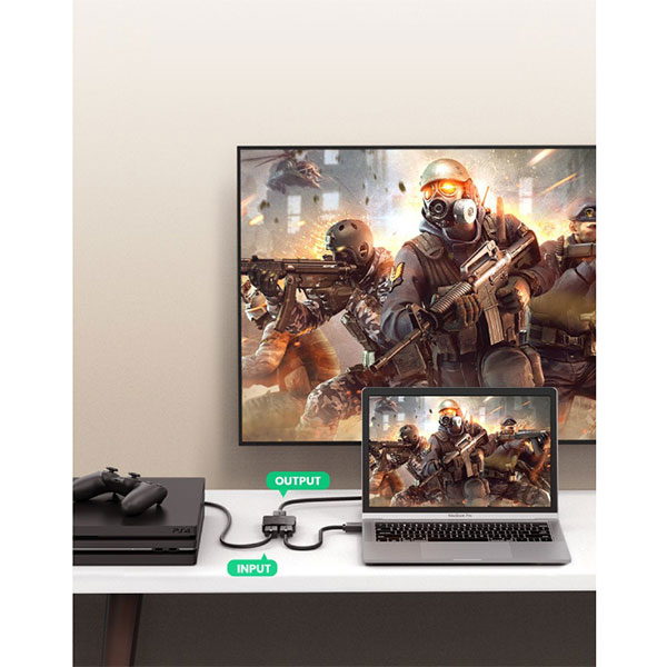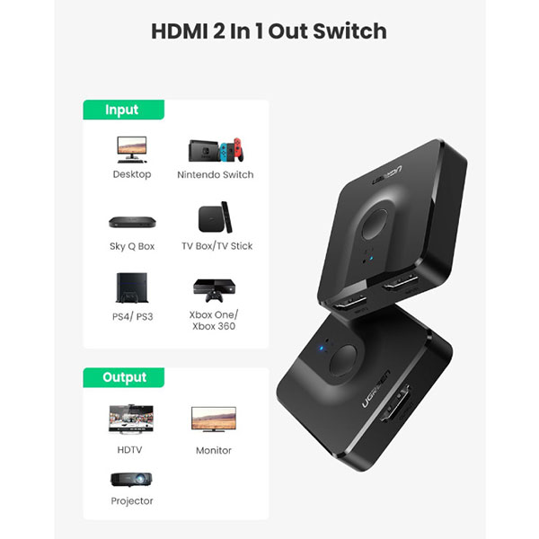 Dvosmerni HDMI prekidač deluje i obrnuto kao HDMI razdelnik (spliter), nudi rešenje za povezivanje jednog HDMI uređaja sa dva spoljna HDMI ekrana i biranje između ekrana, samo jedan HDMI ekran će raditi u režimu razdelnika