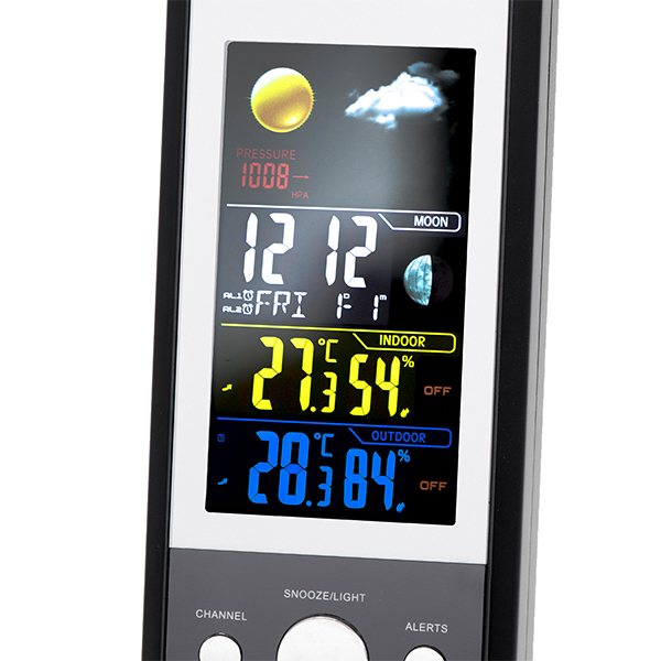 Meteorološka stanica sa satom i vremenskom prognozom Mesko MS1177-Klima koja se stalno menja izvor je vremenskih iznenađenja, jer je sat vremena dovoljan da usred toplog i sunčanog dana počne grmljavina. Vremenska stanica Mesko MS 1177 će vam omogućiti da redovno kontrolišete promene temperature, što može biti nagoveštaj kako će izgledati dan. Zahvaljujući dodatnim funkcijama, meterološka stanica veoma koristan uređaj za svakog od nas! Stanica ima digitalni displej u boji.Vremenska stanica sa satom i vremenskom prognozom Mesko izgleda veoma moderno i elegantno, zahvaljujući čemu će izgledati zanimljivo u svakom enterijeru. Displej je podeljen na deo posvećen unutrašnjim i eksternim očitavanjima, i centralni deo gde vidimo ilustrovano vreme van napolju, vreme i datum raščlanjeno po danu i mesecu.Pored toga, možemo postaviti upozorenja koja će nas upozoravati na visoke/niske temperature i koristiti stanicu kao budilnik. Alarm ima tri podešavanja, koja se razlikuju po učestalosti zvukova, i opciju "dremež", koja će takođe pomoći da se podesi odgovarajući nivo osvetljenja ili da se potpuno isključi. Meteorološka stanica je profesionalni uređaj koji je i za profesionalce i za one koji žele da budu u toku sa vremenskim promenama izvan prozora.
