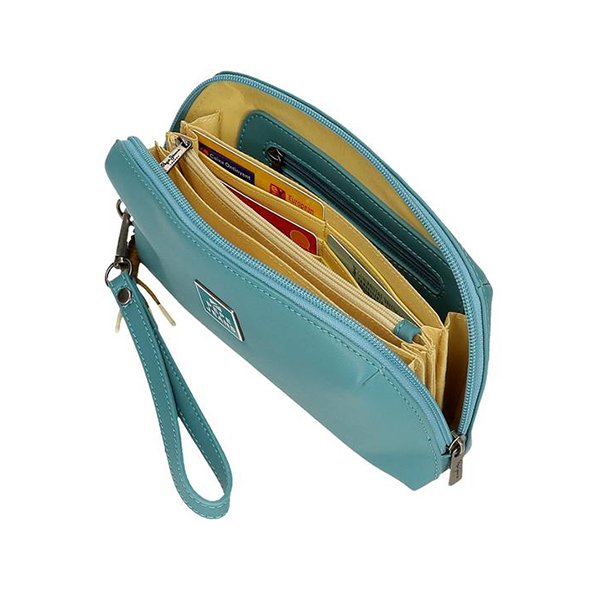 Torbica novčanik Bea 7564133 Pepe Jeans 75.641.33 je elegantna i moderna torba malih dimenzija, idealna za svakodnevne potrebe. Ova torbica je izrađena od fine eko kože koja je prijatna na dodir. Izrađena je u plavoj boji, sa postavom u kontrastnoj bež boji. Model je opremljen kratkom ručkom, koja omogućava nošenje torbice u ruci ili zakačene oko zgloba ruke. Unutrašnjost torbice je pregledno organizovana, sa četiri pregrade, džep za kovanice, šest otvora za kartice i džepom sa patent zatvaračem. Novčanik poseduje specijalni sistem RFID zaštite za kartice koji blokira signale neovlašćenih uređaja za skeniranje radio frekvencijom.